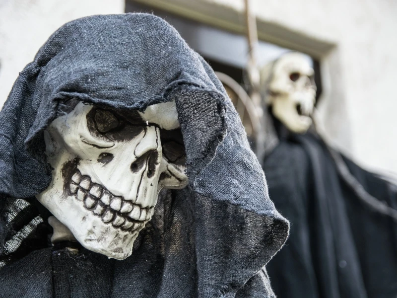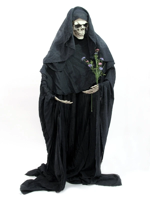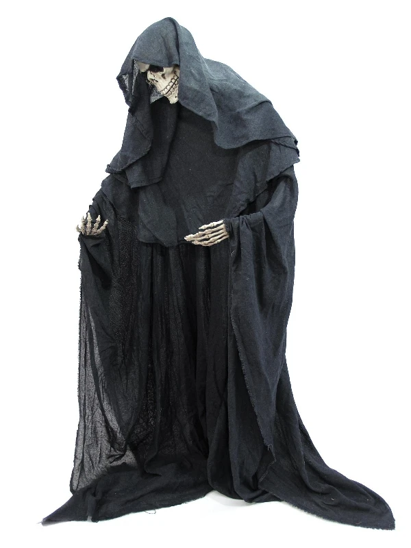 Staande sceleton met zwarte mantel, armen individueel buigbaar